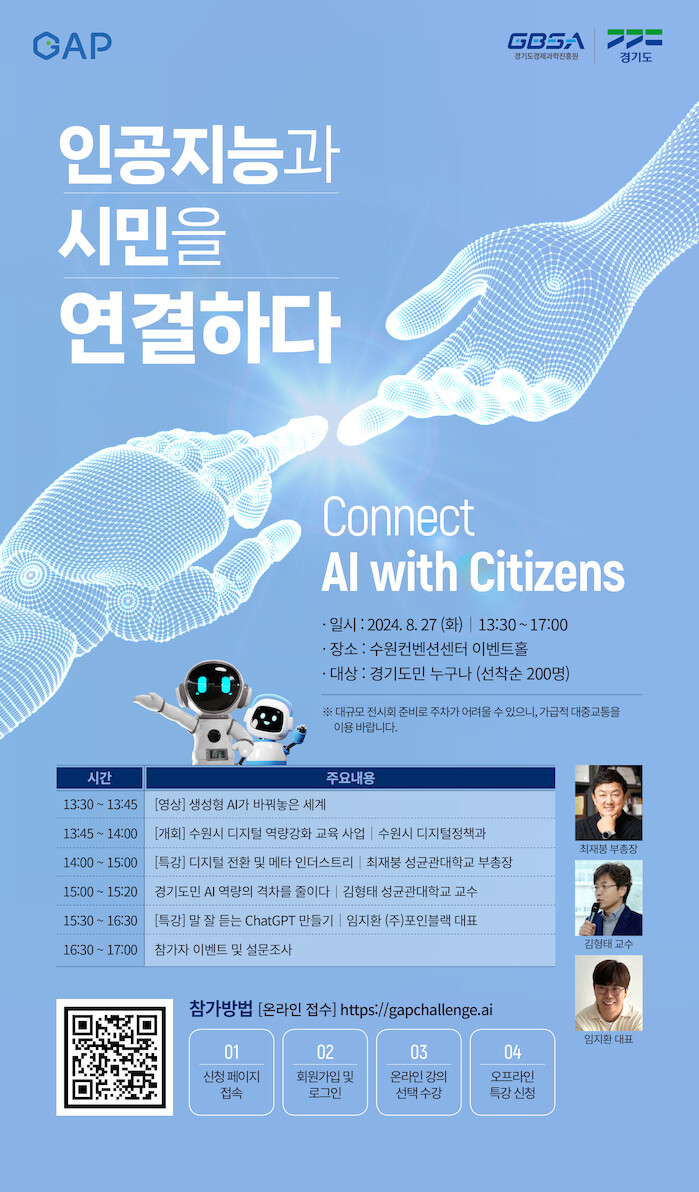 한편 경기도는 8월 27일 수원시를 시작으로, 9월 3일 의정부 경민대학교에서 2차 AI 오프라인 특강을 개최할 예정이다. 자세한 정보는 경기도민 AI챌린지 공식 사이트를 확인하거나 경기도경제과학진흥원 AI산업팀(031-776-4829)에 문의하면 된다.