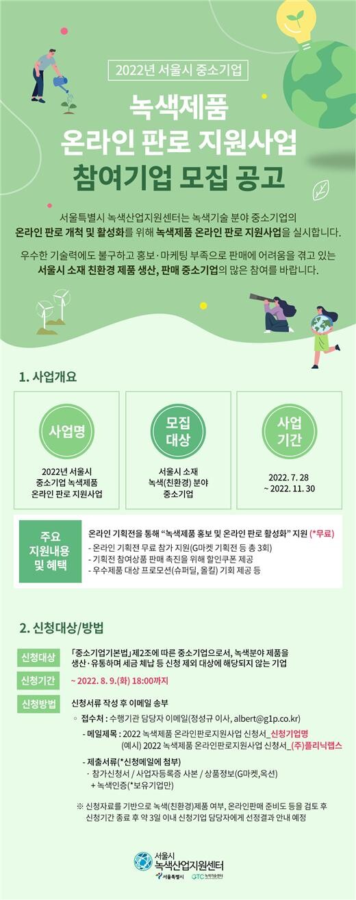 서울 중소기업 녹색제품 온라인 판로 지원사업에 참여를 희망하는 서울시 소재 친환경 제품생산, 판매중소기업은 서울시 녹색산업지원센터로 신청하면 된다.
