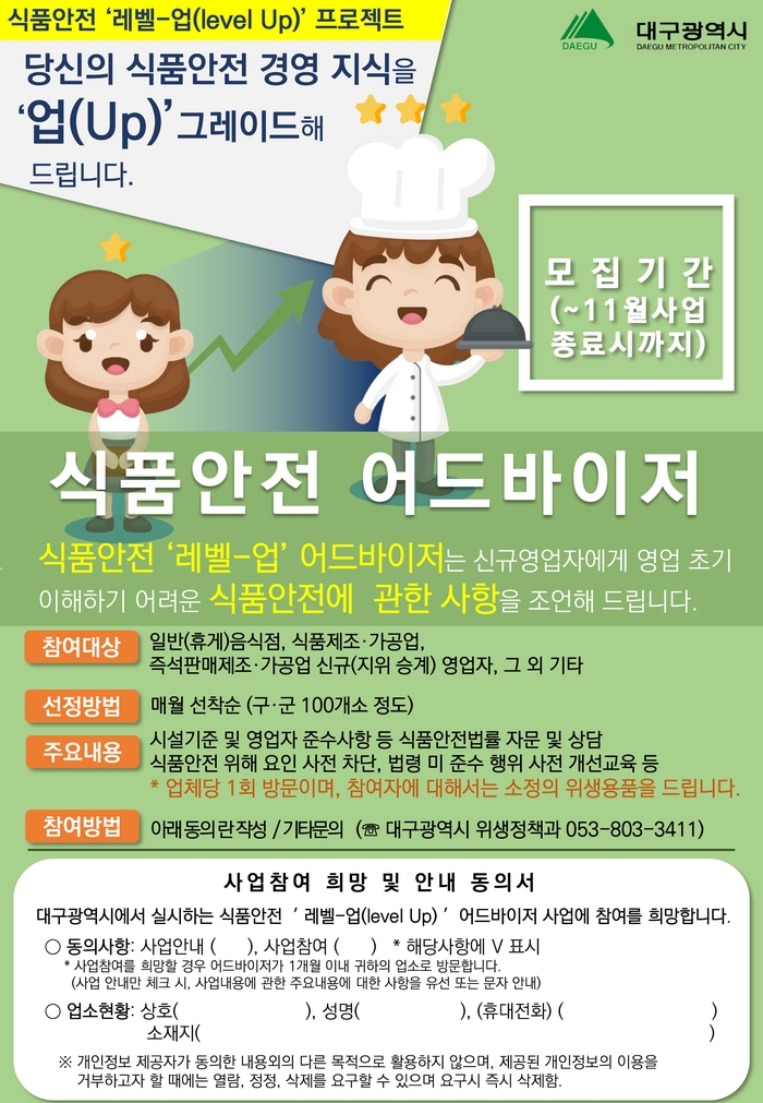 | ▲ ‘식품안전 레벨-업 어드바이저 사업’ 어드바이저 모집 홍보물(대구시 제공) |