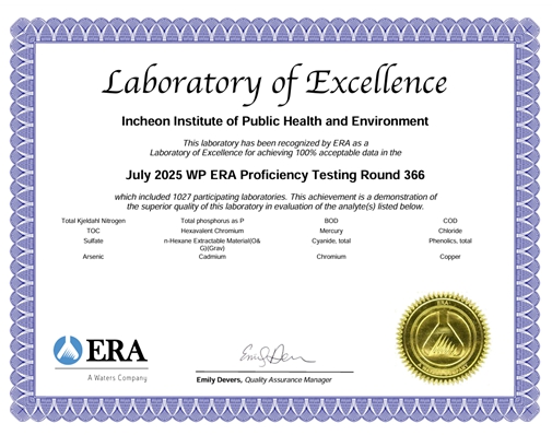 [세계로컬타임즈] 인천광역시 보건환경연구원은 미국 환경자원협회(ERA)가 주관한 2025년 환경분야 국제숙련도 평가에서 ‘최우수 등급(Laboratory of Excellence)’을 받았다고 밝혔다.