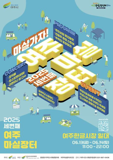 여주마실장터는 지난해에 이어 세 번째로 열리는 행사로, 지역 주민과 상인의 호응 속에 꾸준히 성장해왔다. 여주시 도시재생지원센터는 지난해의 경험과 성과를 바탕으로 올해 마실장터를 더욱 내실 있게 운영해 지속성과 연속성을 이어갈 계획이다. 행사는 양일 모두 오전 11시부터 오후 10시까지 진행되며, 여주 특산물 가공품 및 수공예품, 먹거리·체험 프로그램, 바자회 부스, 문화공연, 시장 영수증 이벤트 등 다채로운 콘텐츠가 운영될 예정이다. 특히 한글시장 상인들이 직접 참여하는 판매 이벤트가 행사에 활력을 더할 전망이다.