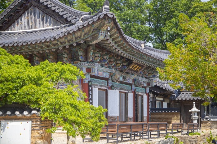 대웅전은 정면 3칸, 측면 4칸 규모로 그 멋과 매력이 여느 사찰 못지 않다. 대웅전의 기둥이 핵심인데, 반듯하게 잘 다듬은 일자형이 아니라 휘어진 나무 본연의 모습을 그대로 이용한게 특징이다. 자연의 결을 그대로 살려 좌우로 굽은 기둥은 묵직하면서도 친근감과 정감이 넘친다. 문화재적 가치도 높아서 보물로 지정되어 있다.