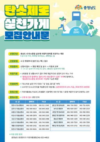 탄소제로 실천가게는 1회용품과 생활폐기물 감축을 위해 충청남도에서 추진 중인 ‘플라스틱 줄이기 실천 서약’에 참여한 뒤, ‘충남형 탄소중립포인트제’에 가입한 업소를 대상으로 지정된다.