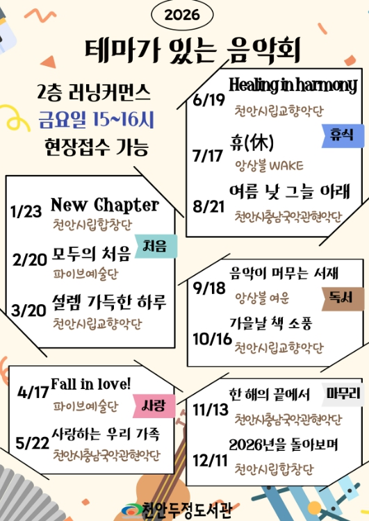 도서관 관계자는 “5가지 테마로 구성된 음악 공연을 통해 시민의 문화 향유 기회를 넓히고, 삶의 만족도가 높아지는 행복한 천안을 만들어 갈 것”이라고 말했다.