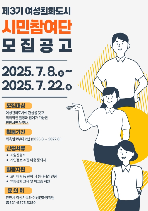 모집 대상은 여성친화도시에 관심을 두고 적극적인 활동이 가능한 천안시민이다.