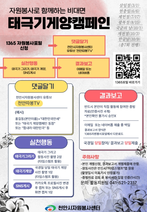 김용석 천안시자원봉사센터장은 “국경일마다 태극기를 게양하는 작은 실천이 나라사랑 문화 확산과 공동체 의식 강화로 이어진다”며 “시민 여러분의 많은 참여를 부탁드린다”고 말했다.