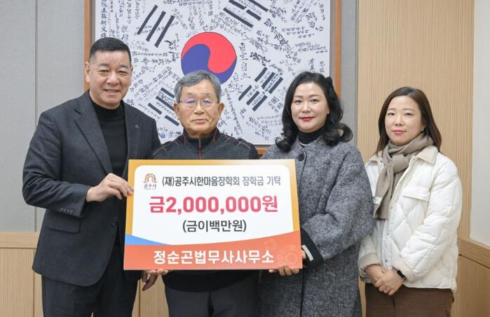 정순곤법무사사무소는 공주시한마음장학회가 설립된 2007년 이후 2016년까지 매년 200만~300만 원의 장학금을 꾸준히 기탁하며 지역 인재 양성에 앞장서 왔다.