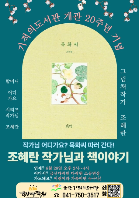 조혜란 작가는 ‘할머니, 어디가요?’ 시리즈와 ‘상추씨, 참새’ 등의 저자로 이날 자신의 저서인 ‘목화씨’를 주제로 특강을 진행한다.