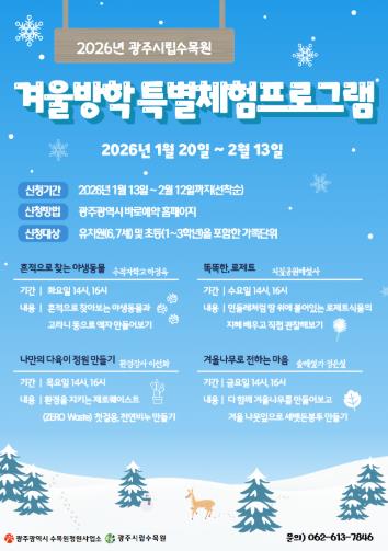 김희석 수목원·정원사업소장은 “이번 겨울방학 특별체험 프로그램을 통해 아이들이 자연을 관찰하고 체험하며 자연에 대한 친근감을 키우길 바란다”며 “앞으로도 시민들이 참여할 수 있는 다양한 프로그램을 지속적으로 운영하겠다”고 말했다.