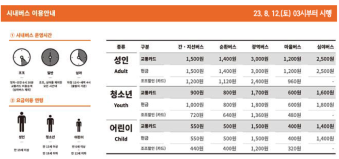 [세계로컬타임즈 이효진 기자] 서울시는 오는 12일 03시부터 일반 카드기준으로 시내버스는 간·지선 1,500원, 순환·차등 1,400원, 광역 3,000원, 심야 2,500원, 마을버스는 1,200원으로 조정한다고 밝혔다.