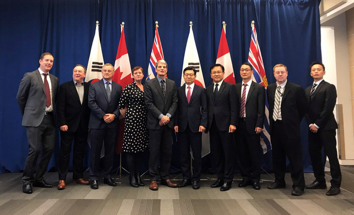 | ▲ 지난 23일(현지시간) 캐나다 밴쿠버 주교통부(Translink) 본청에서 열린 계약식에서 케빈 데스몬드 캐나다 밴쿠버 주교통부 사장(왼쪽 다섯 번째부터)과 김승탁 현대로템 사장이 기념촬영을 하고 있다. |