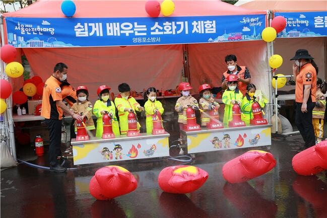 | ▲ ‘2022 서울안전한마당’에서 어린이들이 소화기 체험을 하고 있다. (사진=서울시) |
