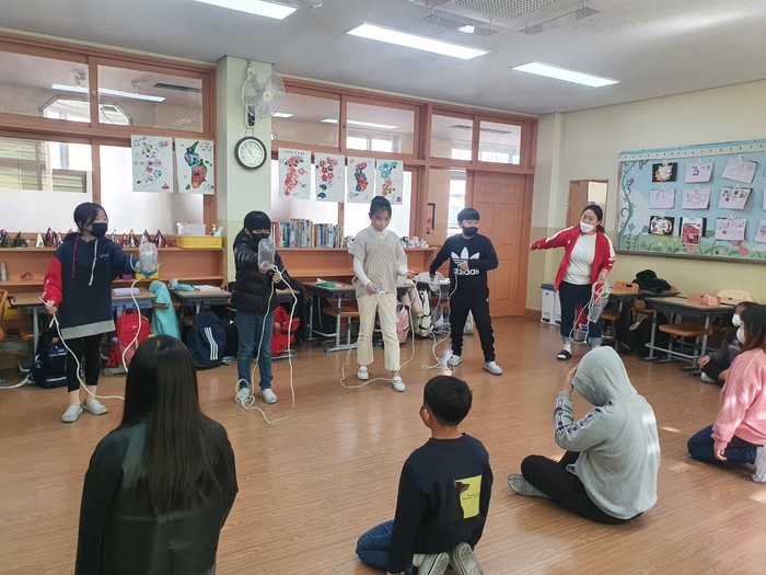 | ▲ 광양백운초등학교 4학년 교실에서 학생들이 도구을 이용한 구조 방법을 실습하고 있다.(사진=광양백운초) |