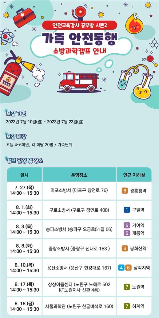 27일부터 8월 18일까지 서울시 전역의 총 7개소(마포소방서, 구로소방서, 송파소방서, 중랑소방서, 용산소방서, 노원구 상상이룸센터 및 서울과학관)에서 각각 1회씩 소방과학캠프를 실시한다.