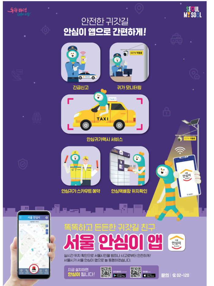 늦은 밤 택시를 타고 귀가할 때는 ▲‘안심귀가택시’를, 귀갓길이 불안할 때는 관제센터에서 CCTV로 귀갓길을 지켜봐주는 ▲‘귀가모니터링’을, 귀가 동행이 필요할 때는 ▲‘안심귀가 스카우트’를 신청‧예약해 이용할 수 있다.