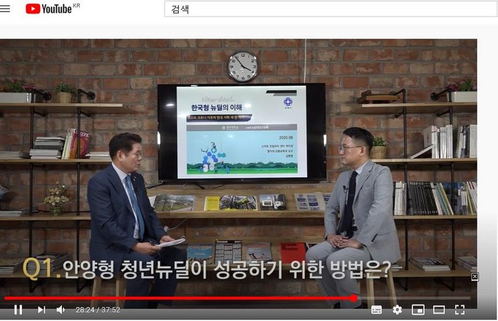 이 동영상은 김현명 명지대 교통공학과 교수가 ‘포스트 코로나시대와 한국형 뉴딜의 이해’를 주제로 강연하고, 최대호 안양시장이 안양형 뉴딜에 대한 추가 설명과 함께 묻고 답하는 형식의 40분 분량이다. ‘뉴딜&뉴라이프 안양’은 지난 8월 24일 녹화를 통해 제작됐다.