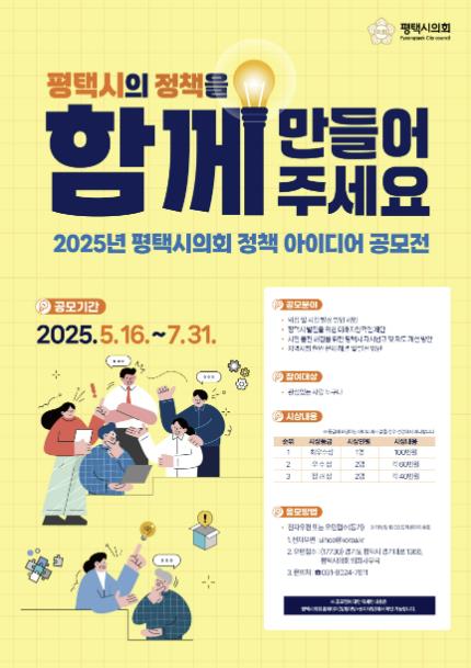 심사는 실현 가능성, 창의성, 효율성 등을 기준으로 이루어지며, 시상은 최우수상 1건(상금 100만 원), 우수상 2건(각 60만 원), 장려상 2건(각 40만 원)이다. 평택시의회는 이번 공모전을 통해‘혁신 입법' 모델을 구축할 계획이다.