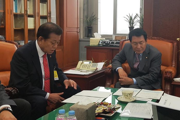 | ▲ 유천호(왼쪽) 강화군수가 안상수 예결위원장과 면담을 하고 있는 2018년 당시 모습. (사진=강화군 제공) |