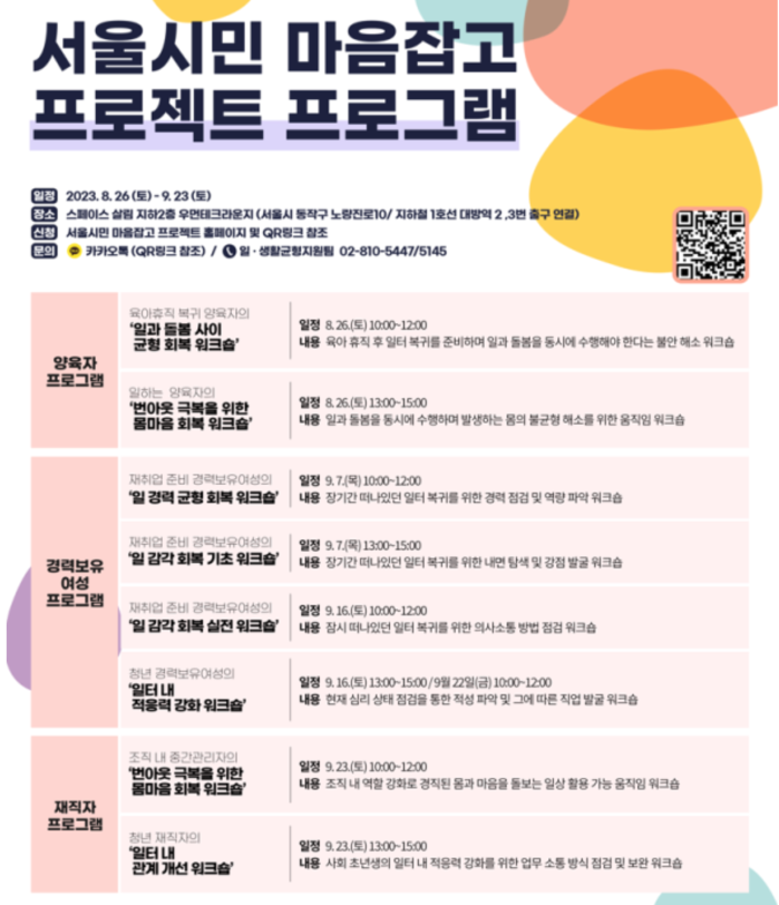 ‘서울시민 마음잡고 프로젝트2.0’은 재취업을 준비하는 양육자, 청년으로 대상을 확대해 스트레스를 진단해보고 내 상황에 맞는 마음회복 콘텐츠와 상담, 워크숍 등 다양한 온‧오프라인 프로그램을 무료로 이용하는 프로젝트다.