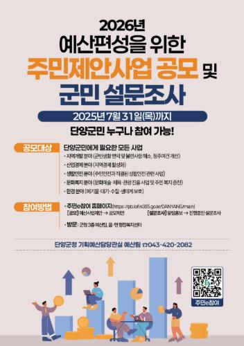단양군민은 물론 관내 직장·학교·단체에 소속된 사람이라면 누구나 제안서를 제출할 수 있으며, 제출된 제안은 타당성 검토와 주민참여예산위원회 심의를 거쳐 2026년도 예산안에 최종 반영된다.