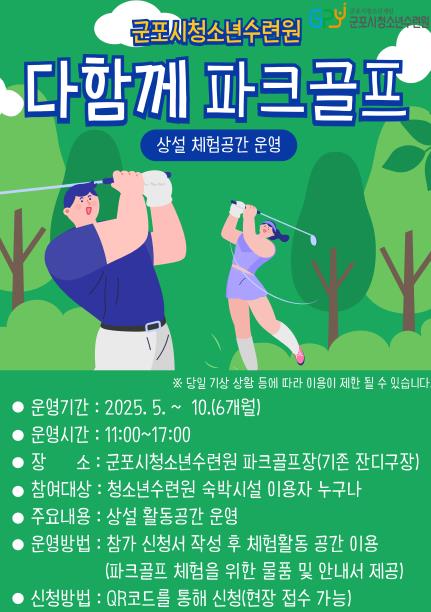 청소년수련원 숙박시설 이용자 누구나 무료로 이용할 수 있고, 파크골프채 등 장비 또한 무상으로 대여받을 수 있으며, 현장에서 제공되는 큐알코드를 통해 체험신청서를 작성(온라인. 네이버 폼 등)하면 체험을 즐길 수 있다.