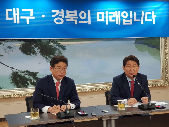 | ▲ 지난 2일 대구시청 기자실에서 권영진 대구시장(오른쪽)과 이철우 경북도지사가 긴급 브리핑을 통해 대구 군공항 이전부지 선정을 올해 안에 완료할 계획이라고 밝히고 있다.(사진=뉴시스) |