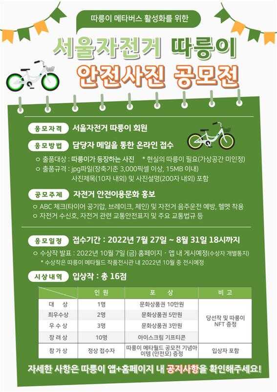 또한, 최종 수상자 16명에게는 수상 사진작품 및 따릉이 이미지를 활용해 만든 NFT를 각 1개씩 증정할 예정이다.