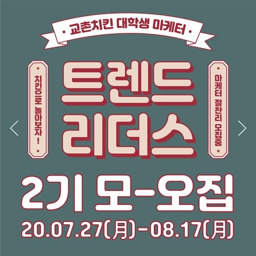 모집대상은 대학생 교촌치킨 주문앱 멤버십 회원으로, 총 28명을 선발해 4인 1조로 운영될 예정이다. 지원은 지원은 내달 17일까지 교촌치킨 주문앱 멤버십 회원가입 후 트렌드리더스 모집 배너를 클릭해 접수할 수 있으며, 최종 합격자는 이달 21일 발표된다.
