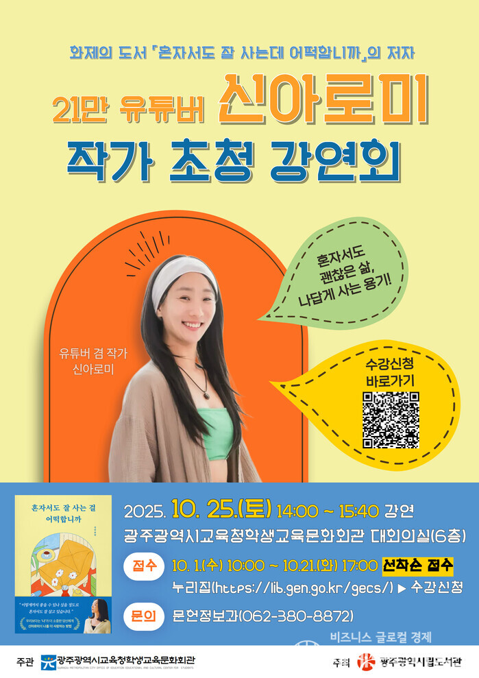 이날 신 작가는 ‘혼자서도 괜찮은 삶, 나답게 사는 용기‘를 주제로 광주시민들에게 싱글라이프와 자기 존중의 가치에 대한 이야기를 들려주고, 소통하는 시간도 갖는다.
