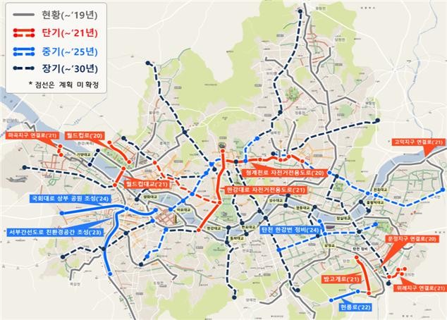 서울을 남-북(광화문~한강대로~한강대교~여의도)과 동-서(청계천~성북천‧정릉천‧중랑천‧한강)로 연결하는 자전거 간선망이 완성될 예정이다.