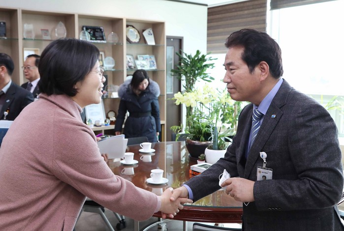 | ▲ 백군기(오른쪽) 용인시장이 권진선 농관원 경기지원장과 협의 후 악수하는 있다.. (사진=용인시 제공) |