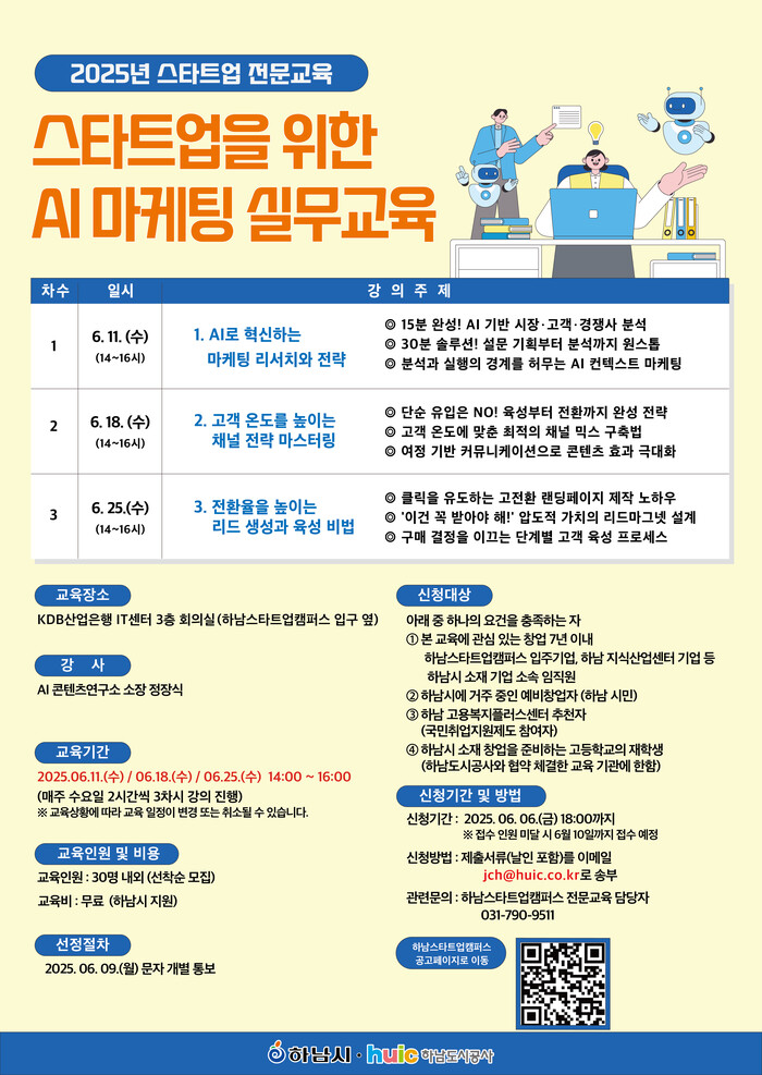 이번 교육은 6월 11일, 18일, 25일 매주 수요일 2시간씩 3차시로 구성하였고, KDB 산업은행 IT센터 3층 회의실에서 대면 강의로 진행한다. 이 교육은 하남시의 지원을 통해 전액 무료로 진행되고 교육 신청과 자세한 공고 내용은 하남도시공사, 하남스타트업캠퍼스 또는 하남시청 홈페이지 등에서 확인 가능하다.
