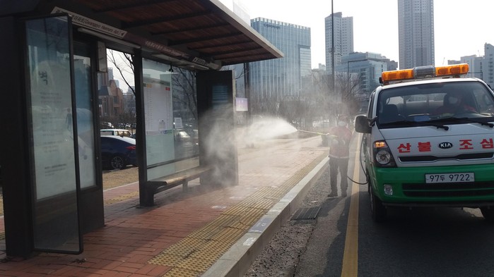 | ▲ 영통구 버스승강장 2차 집중방역을 하고 있다.(사진=수원시 제공) |