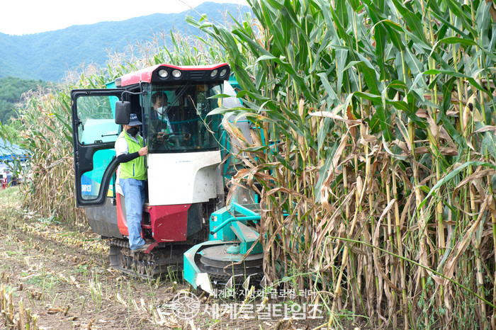 [세계로컬타임즈 김병호 기자] 제천시는 제천시축산단체협의회와 공동으로 지난 6일 백운면 도곡리 일원에서 베일러와 랩핑기를 활용한 사료용 옥수수 수확 시연회를 가졌다.