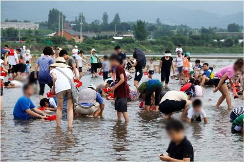 ▲ 충북 괴산군이 오는 7월 29일부터 31일까지 3일간 둔율마을 강변일원에서 '제9회 둔율올갱 이 축제'를 개최한다. 사진은 지난해 축제에 참가한 시민들이 올갱이를 잡고 있는 모습. <사진 제공=괴산군청> |