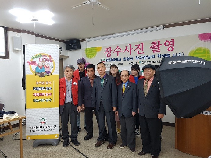 이날 봉사활동에는 학과장인 한창규 교수를 비롯해 학생 등 20여 명이 참여해 회원들의 장수사진을 촬영했다.