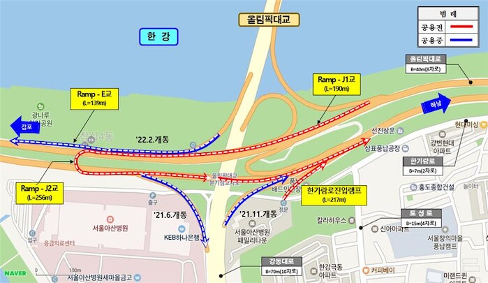 올림픽대교→올림픽대로(하남방향) 진입, 올림픽대로(김포방향)→강동대로 진입 가능