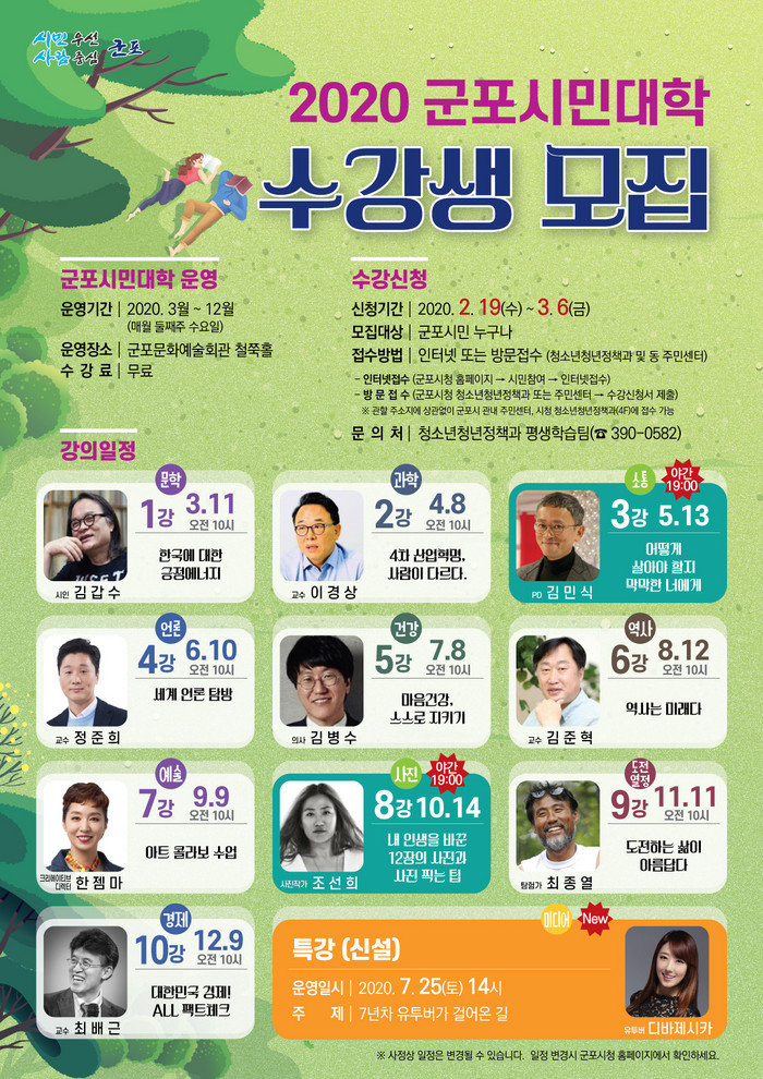 군포시 청소년청년정책과장은 “군포시민대학은 열린 교육을 통해 시민 삶의 질 향상을 꾀하는 평생학습 강좌”라며 “여론을 수렴해 올해 운영 방식에 일부 변화를 시도했고, 앞으로도 계속 개선해 나갈 것”이라고 밝혔다.