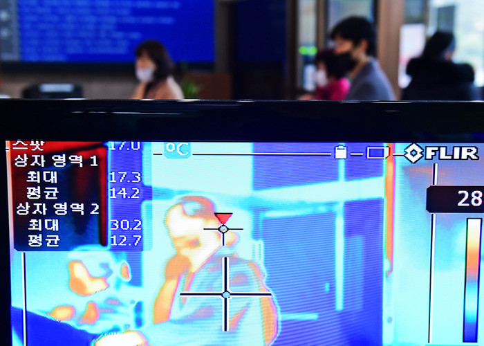 수원시는 지난 24일 수원시청 주출입구를 제외한 모든 문을 폐쇄했다. 공직자 등 모든 출입자는 마스크를 반드시 쓰고, 세정제로 손을 소독한 후 열화상감지카메라를 통과해야 청사에 들어올 수 있다.