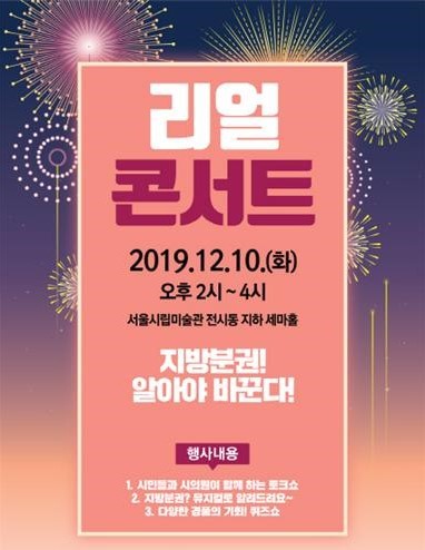 [세계로컬타임즈 이효진] 기존의 강의 형식의 교육이 아닌 토크쇼·연극공연·퀴즈쇼 등 다양한 프로그램을 통해 지방분권 실현 필요성에 대해 쉽게 알 수 있도록 진행하는 ‘리얼 콘서트’가 열린다.