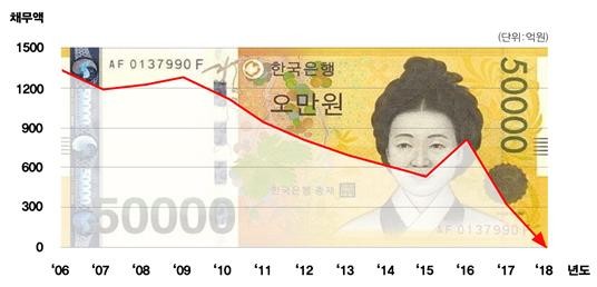 | ▲ 2006년 1313억원이었던 강릉시 채무액이 효율적인 예산운용으로 올해 0원이 됐다. 이미지는 채무액 변화 그래프. <제공=강릉시청> |