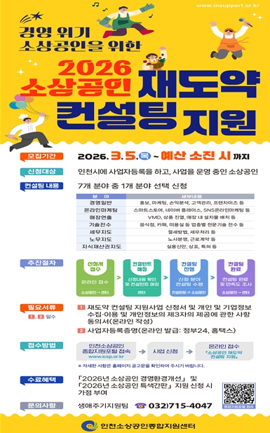 사업 신청은 3월 5일부터 진행하며, 신청과 관련하여 자세한 사항은 인천소상공인종합지원포털에서 확인할 수 있다.