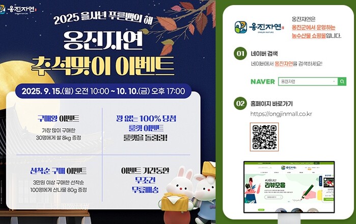 이번 행사는 옹진군 공식 쇼핑몰‘옹진자연’과 우체국 쇼핑몰‘옹진브랜드관’에서 각각 운영되며, 기간과 혜택이 다양하게 구성되어 소비자들에게 풍성한 명절 혜택을 제공할 예정이다.