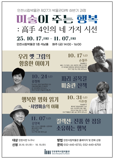 김태익 인천시 시립박물관장은 “이번 프로그램은 각기 다른 시선으로 미술을 이야기해 온 네 분의 명사를 한 자리에 모신 특별한 자리”라며, “시민들이 쉽고 흥미로운 강의를 통해 미술을 알아가는 즐거움과 함께 일상 속에서 새로운 행복을 발견하기를 기대한다”고 말했다.