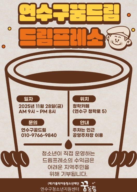 일일 카페 ‘드림프레소’는 센터의 창업지원 사업의 하나로, 바리스타 및 제과제빵 자격증을 취득한 학교 밖 청소년들이 직접 카페를 운영해 보며 실전 경험을 쌓는 프로그램이다.