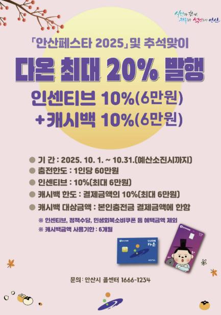 이민근 안산시장은 “민족 대명절인 추석과 안산페스타 2025 상권축제를 계기로 지역 소상공인과 시민이 함께 혜택을 누릴 수 있도록 이번 행사를 마련했다”며 “짧은 기간 동안 상대적으로 높은 혜택이 제공되는 만큼 많은 시민이 다온카드를 통해 소비하며 지역경제 활성화에 동참해 주시기를 바란다”고 말했다.