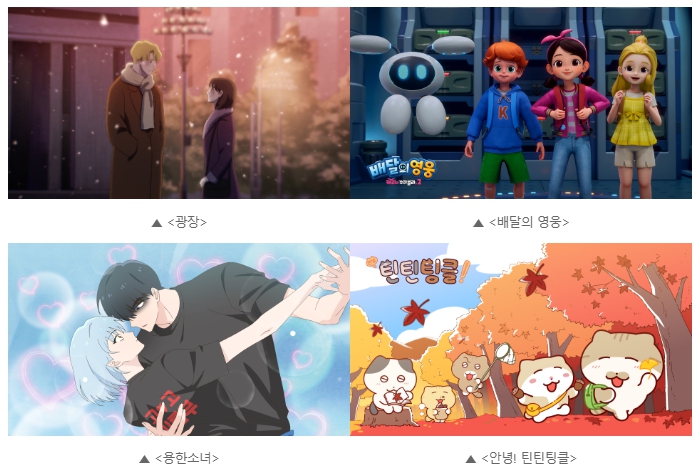 이번 상영작은 국내·외에서 주목받은 화제작들이 다채롭게 상영된다. 제49회 안시국제애니메이션영화제 ‘콩트르샹’ 부문 수상작인 김보솔 감독의 장편 애니메이션 '광장'을 비롯해, 온 가족이 함께 즐길 수 있는 뮤지컬 애니메이션이자 대표적인 K-키즈 콘텐츠인 ‘캐리’ 시리즈의 두 번째 극장판 '배달의 영웅'이 상영된다. 또한 네이버 웹툰 원작을 바탕으로 라프텔에서 오리지널 애니메이션으로 제작된 '용한소녀', 고양이 캐릭터들의 우애와 가족애를 따뜻하게 그린 '안녕! 틴틴팅클'도 함께 만나볼 수 있다.