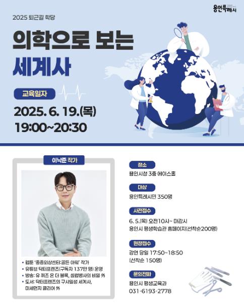 참가 신청은 6월 5일 오전 10시부터 용인시 평생학습관 홈페이지를 통해 선착순 200명을 모집하며, 강의 당일 오후 5시 50분부터는 현장에서도 선착순 150명을 접수한다.