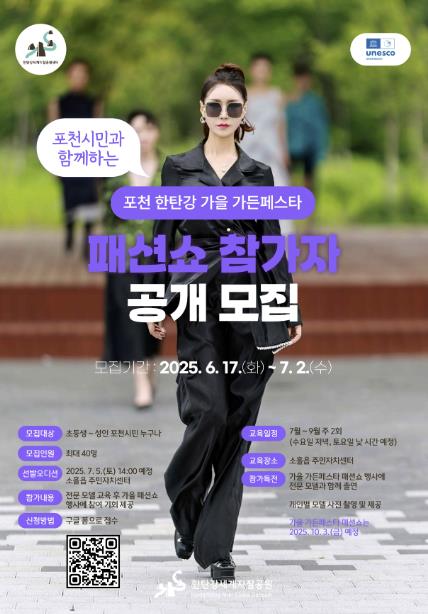 포천시 관계자는 “이번 패션쇼는 남녀노소 누구나 참여할 수 있는 시민참여형 행사다. 일상 속 모델이라는 새로운 경험을 통해 자신감을 얻는 뜻깊은 기회가 될 것”이라며, “많은 시민의 적극적인 참여를 기대한다”고 말했다.