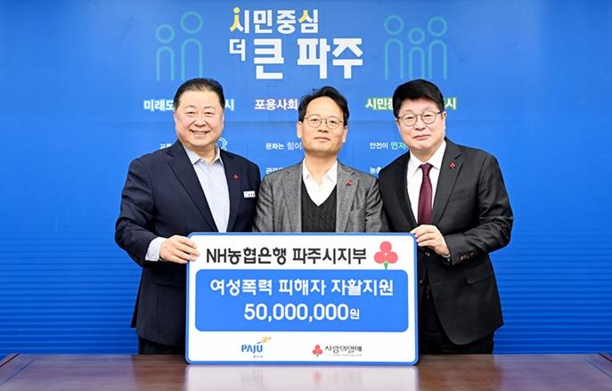 이날 기탁식에서는 김경일 파주시장과 이학필 엔에이치(NH)농협은행 파주시지부장, 경기사회복지공동모금회 권인욱 회장을 비롯한 관계자들이 참석해 여성폭력 피해자 지원을 위한 협력 방안에 대해 뜻을 모았다.